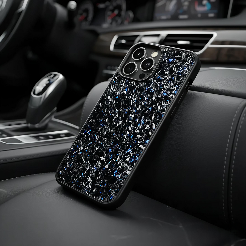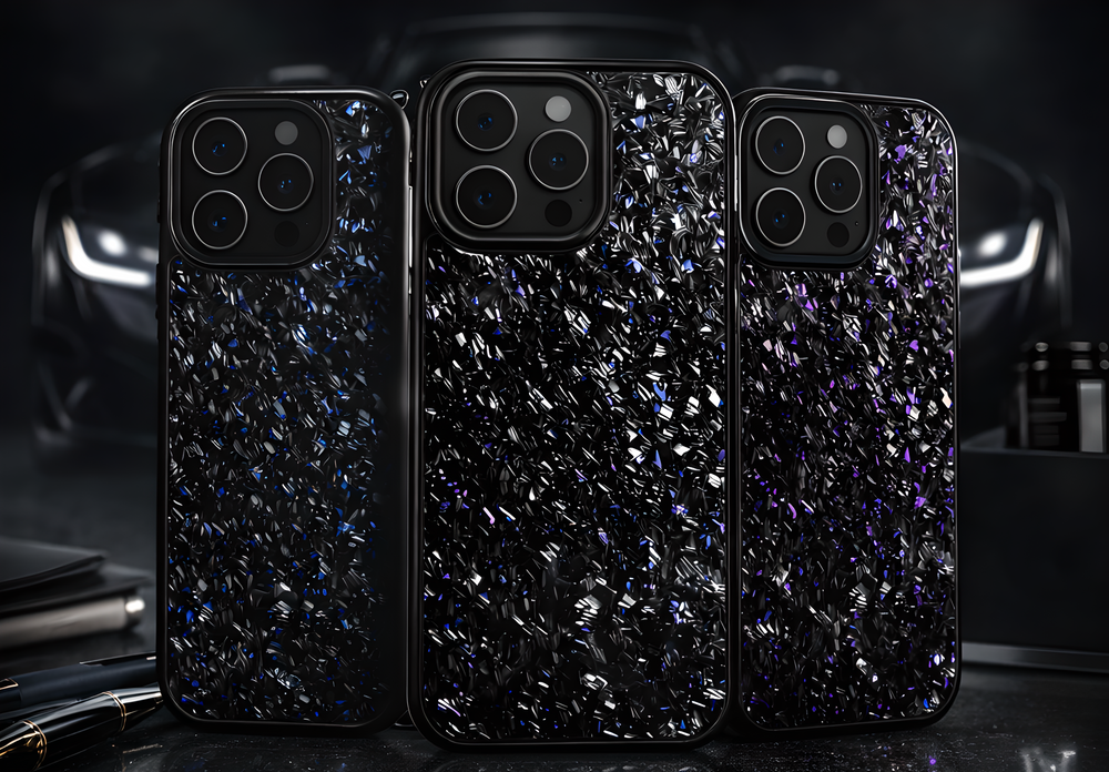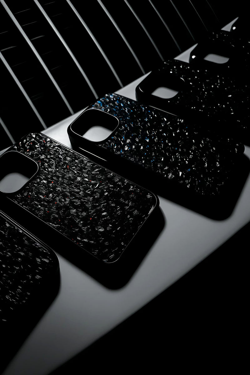 Formed from compressed carbon fiber, each case features a naturally unique, one-of-a-kind pattern — lightweight, durable, and unmistakably premium.